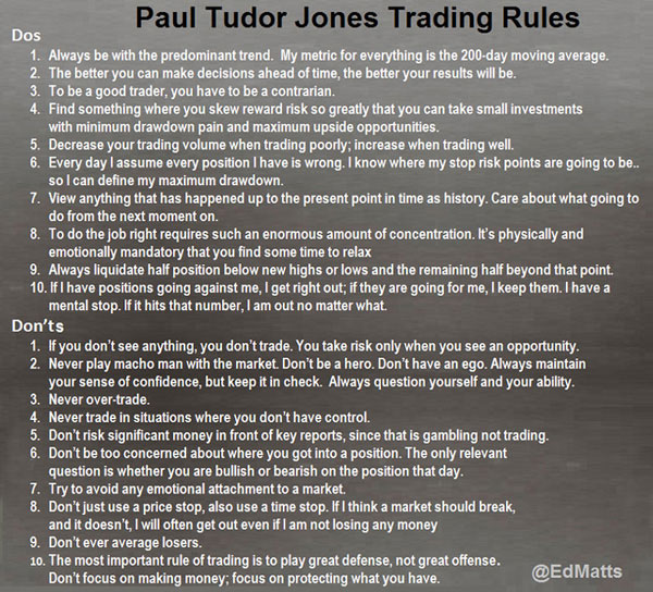 Paul Tudor Jones is an American Trader founder of Tudor Investment Corporation. Paul Tudor long-term annual returns are close to 19.5%. Here are some important rules by this notorious trader.